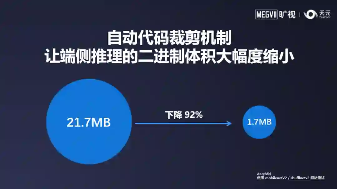 其次,天元 1.0 预览版新增自动代码裁剪功能。在实际的 AI 应用开发中,用户经常面临模型大小的问题。自动代码裁剪功能让用户可以全自动的针对自己网络使用的算子进行代码裁剪,不用手工配置就能最小化推理时的代码体积,极大提升端侧推理的竞争力。