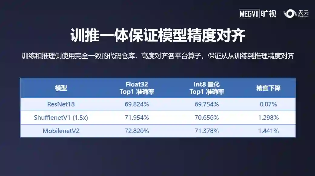 另外,由于训推一体化,模型在训练阶段与推理阶段可以高度对齐,这使得量化感知训练产生的模型可以无风险的在端侧应用。同时天元拥有精心设计的量化训练模块,大大降低了量化感知训练模型的使用门槛。