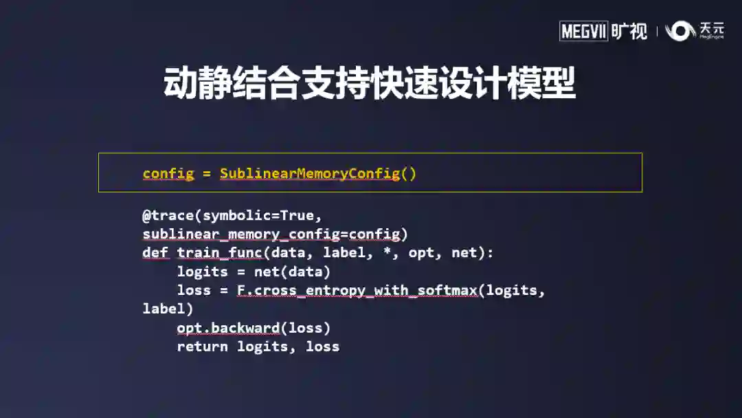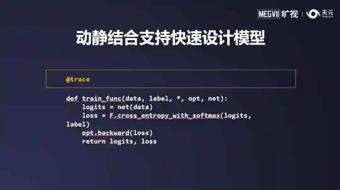 动态图训练对程序员友好,可以随时停下来 Debug;而静态图的训练好处是可以让训练的精度、内存消耗和训练速度达到最优。如何兼得动态图训练和静态图训练的好处?天元通过动静结合支持快速模型设计。动态模式下,天元可以方便的排查模型问题,在遇到错误后及时停下,便于分析模型结构上的异常问题。通过添加一行 trace,模型可以被直接转换为静态图模式,获得静态图所独有的图优化,一方面可以更好的对显存进行复用,提高显存利用率,另一方面可以优化计算顺序,提升模型的训练性能。