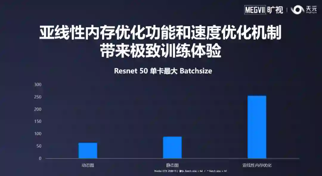 在 Beta 版天元推出了亚线性内存优化技术。目前天元是唯一一个支持全自动亚线性内存优化技术的框架。静态模式下,在静态图的基础上,额外添加一个配置项,则可以便捷的启用亚线性内存优化。天元内置的 Sublinear 亚线性内存优化功能,可以对任意的模型结构进行内存优化,在相同的显卡下,可以训练出更大更准确的模型。