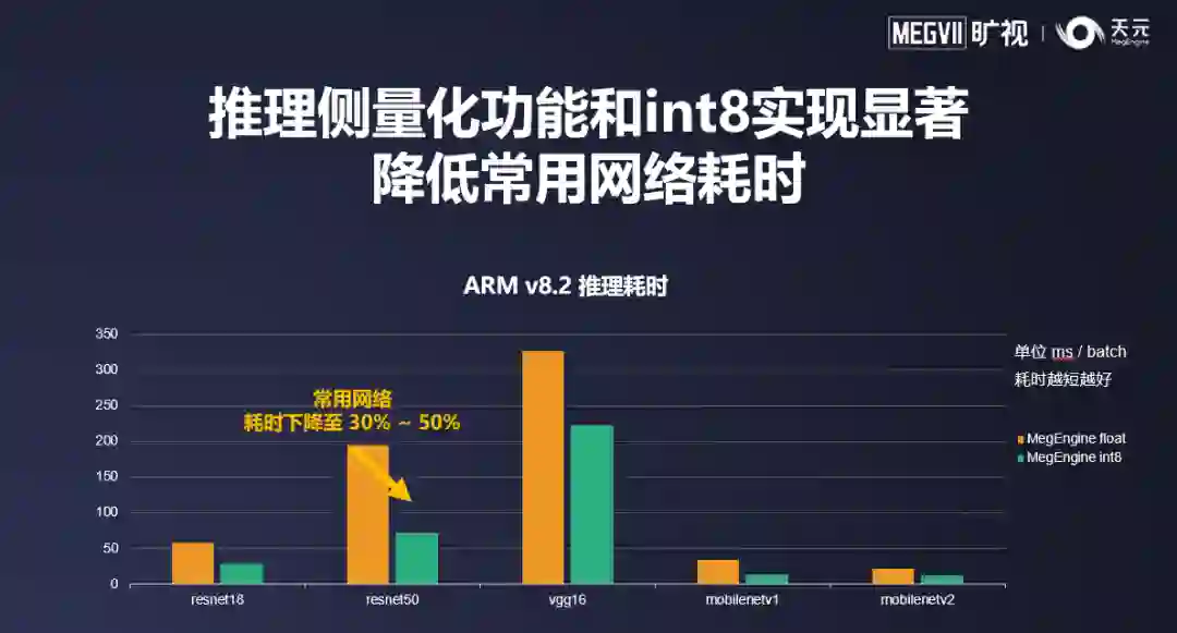 以上表格中,在各类模型上,通过应用量化感知训练,可以在极小的精度下降前提下,使用 int8 推理。量化感知训练产生的高精度模型,配合上天元经过高度优化的 int8 算子,可以将各个常见网络的推理耗时降至浮点模型的 30%~50% 以内,有效带来性能加速。