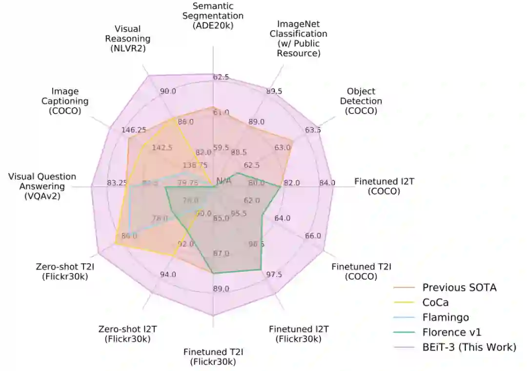 与其他特定模型或基础模型相比,BEiT-3 在广泛任务中实现了最佳性能