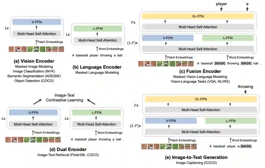 此外,通过模块化的设计,统一架构可以用于不同的视觉及视觉-语言下游任务。其中,Multiway Transformer 每一层都包括一个视觉专家和一个语言专家。