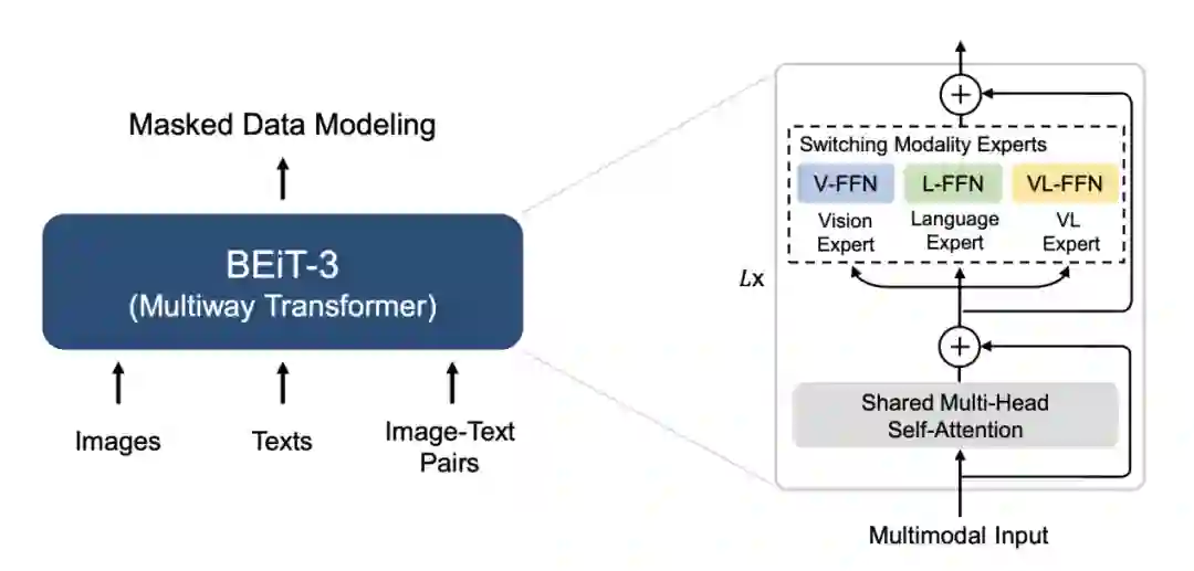 而对于 BEiT-3 来说,其核心思想就是把图像作为一种外语进行建模和学习,从而实现以统一的方式完成图像、文本和图像-文本的掩码“语言”建模,这也在自然语言处理领域被证实为最有效的扩大模型规模的技术方向和方案,这也将成为规模化基础模型一个颇有前景的方向。