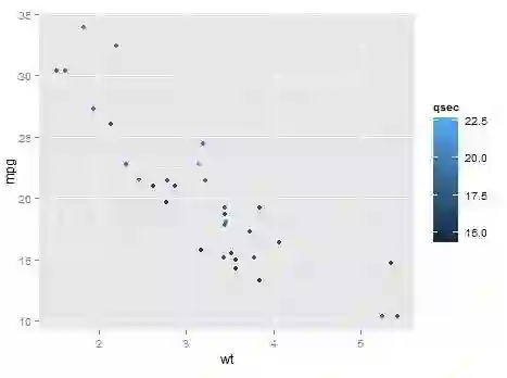 code 2: 指定了qsec作为其染色的标准(分组),qsec为numeric变量,因此,应该选择连续型的标尺,而不是分组染色。然后开始绘制,读取mtcars$mpg[1]、mtcars$wt[1],确定位置,然后为其染成mtcars$qsec[1]颜色;再绘制第二点。