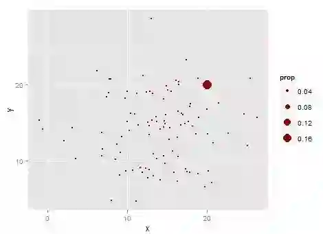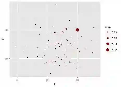 好了,解释一下,stat_sum实际的意思就是按照某一点占所有点出现频率然后换算成大小来作图,因此,以上代码就可以得到下面这张图,因为(20,20)这个点出现频率为20/120=16.667%: