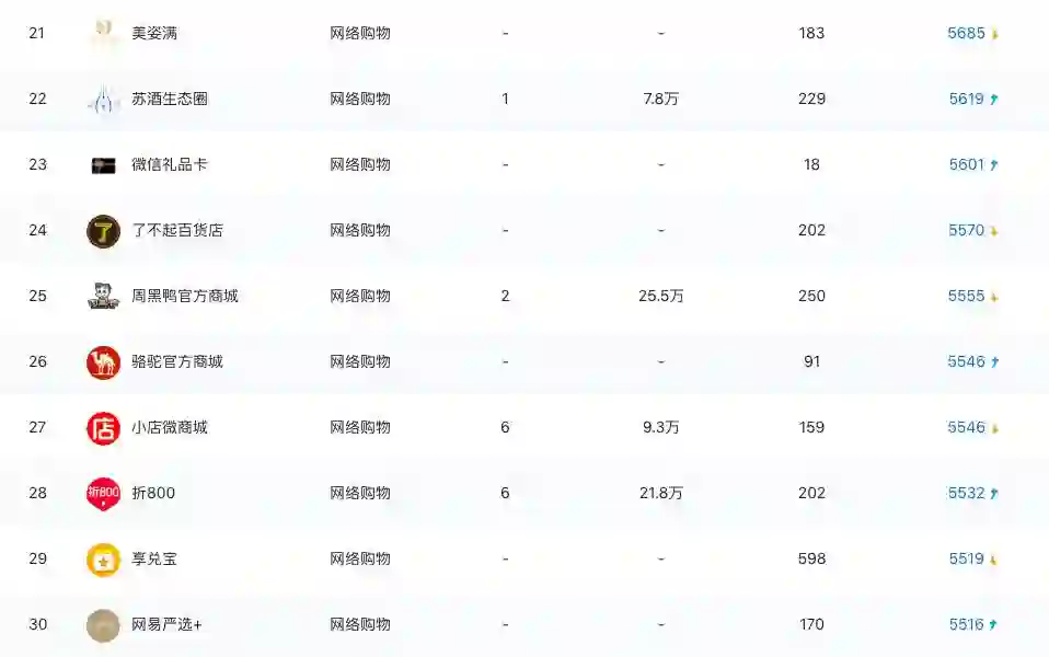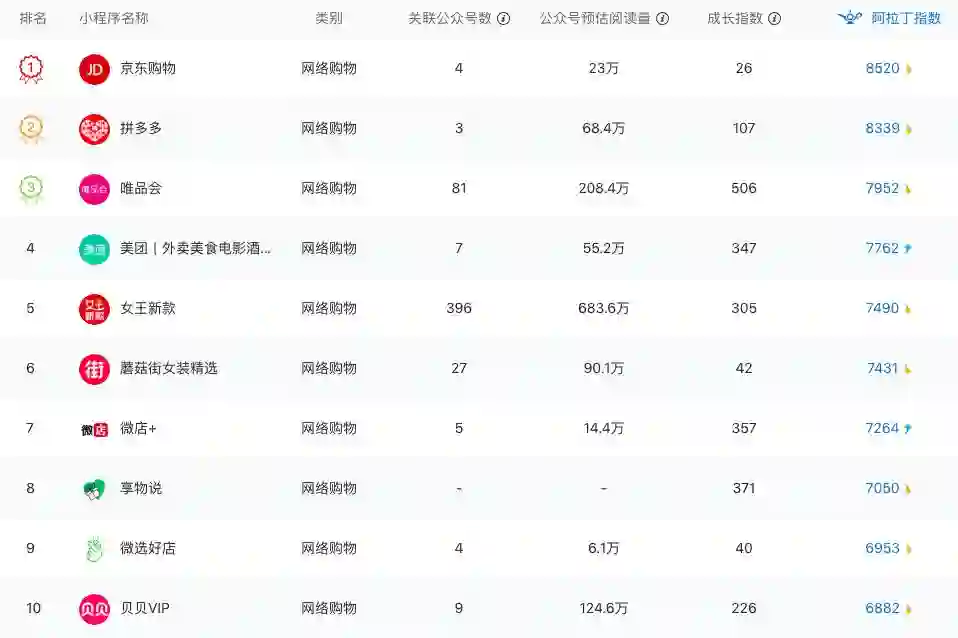 根据阿拉丁指数,在购物标签是一共有93747个小程序样本,排名在前三十的小程序中,近一半是大平台或大品牌的应用小程序,主要目的是渠道补充,商业模式也是基于搜索的货架电商模式,比如小米、京东购物、唯品会、蘑菇街、苏宁、周黑鸭等。