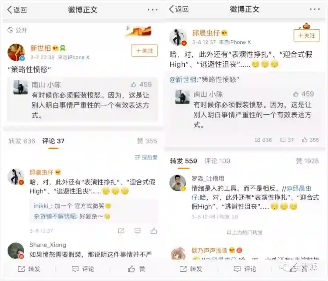 3月7日@新世相提出“策略性愤怒”一词,在奇葩说辩手@邱晨虫仔转发并补充“表演性挣扎”、“迎合式假high”、“逃避性沮丧”三词后,转评赞的数量统统都实现了质的飞跃,不少网友转发表认同的同时也纷纷加入到补充新词的队伍中。