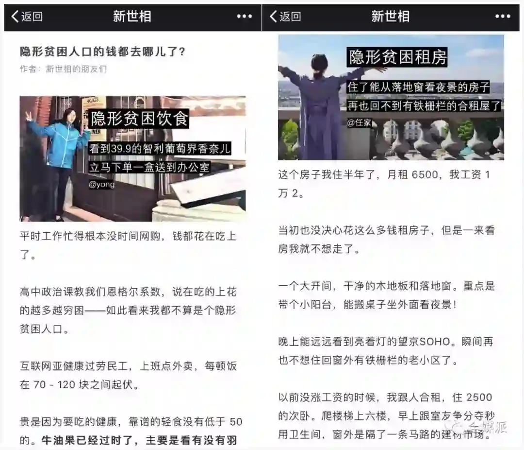 公众号“新世相”在“隐形贫困人口”一词火起来的第二天趁热打铁发布《你这么能花钱,一定很穷吧 | 隐形贫困人口都把钱花哪了》一文,文中采访了7位新时代的“新穷人”,讲述他们都把钱都花在哪了。第一人称的叙述让人更有代入感和亲切感,对话式的交流让读者自觉加入到留言区的讨论中。