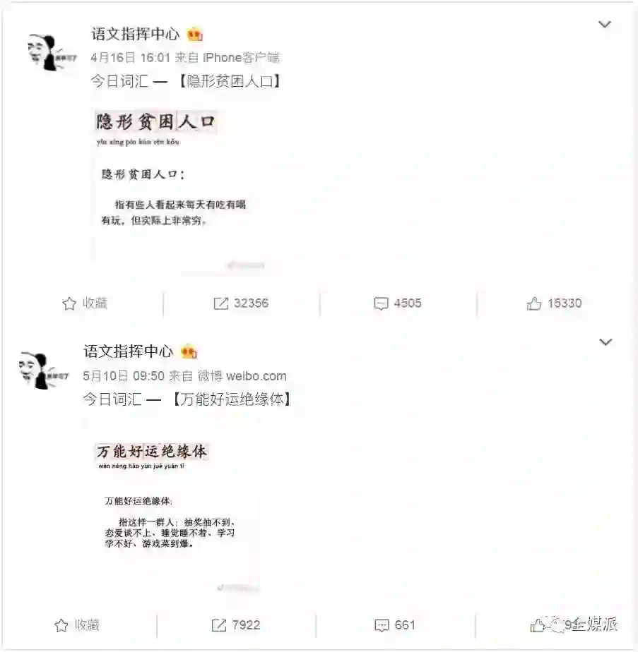 每一个成功热词的背后都站着N个微博大V。微博博主@语文指挥中心在4月16日凭借着“隐形贫困人口”一词成名。其言简意赅的造词造句能力、极度写实的描写刻画,成功吸引九万粉丝慕名前来,不少网友嘴上说着“内容引起极度不适,举报了”,却还是捂着心口按下了转发键。