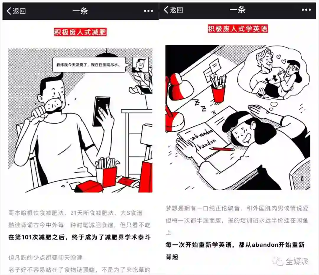 网络热词“积极废人”缘起公众号“一条”4月25日发布的文章《那么爱立Flag,你一定是积极废人吧!》,文章中列举了关于“积极废人”的六个例子,生动的插画搭配诙谐的语言,让人在会心一笑的同时也表示被扎到万箭穿心。