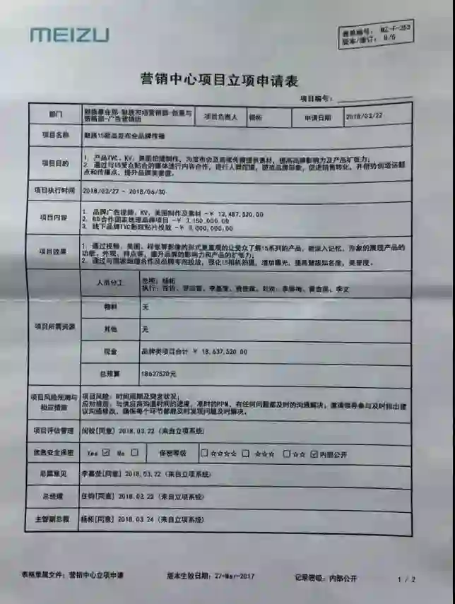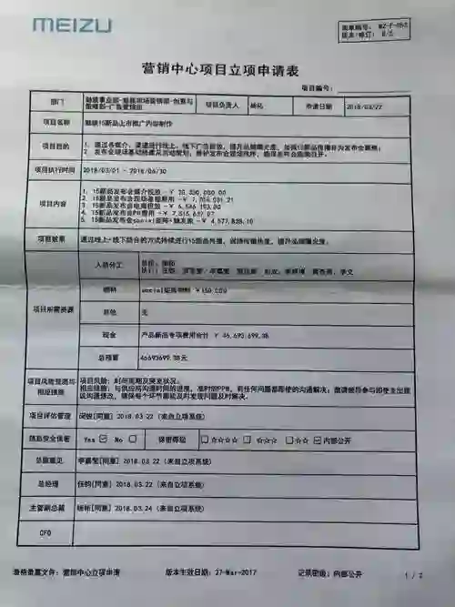 另有名为“魅族15新品发布会品牌传播”的项目,需要申请总计18637520元的预算,以期达到“提高魅族知名度、美誉度”的目的。两者相加共计65331219元。