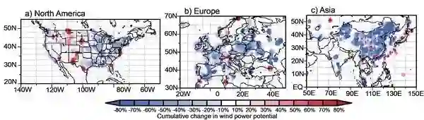 图1. 风能资源累积变化分布。a)北美洲,b)欧洲和c)亚洲1979年至2016年风能累积变化。