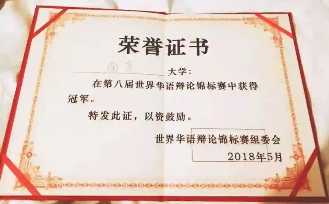 对于一位即将结束辩手生涯的我来说,没有什么比世锦赛夺冠更好的结局了。能遇上一群非常强劲的队友,是我最大的幸运。从九年前第一次战战兢兢站上辩论台到现在,辩论赛带给了我无数的笑与泪。虽然很老土,但还是想说一句:梦想还是要有的,万一实现了呢?