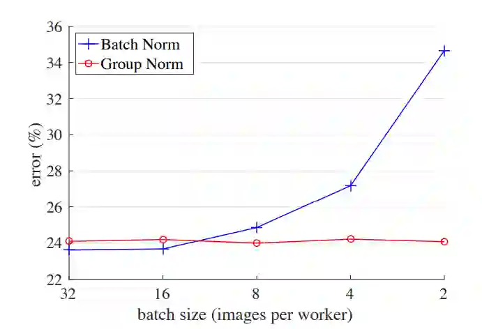 这些方法处理方式和BN类似,但是归一化的维度不一样,BN是在(N, H, W)维度上,LN是在(H,W,C)维度上,IN是在(H,W)维度上,GN更巧妙,其通过对C分组,此时特征可以从[N, H, W, C]变成[N, H, W, G, C/G],GN的计算是在[H, W, G]维度上。LN,IN以及GN都没有在B维度上进行归一化,所以不会有BN的问题。相比之下,GN是更常用的,GN和BN的效果对比如图2所示:
