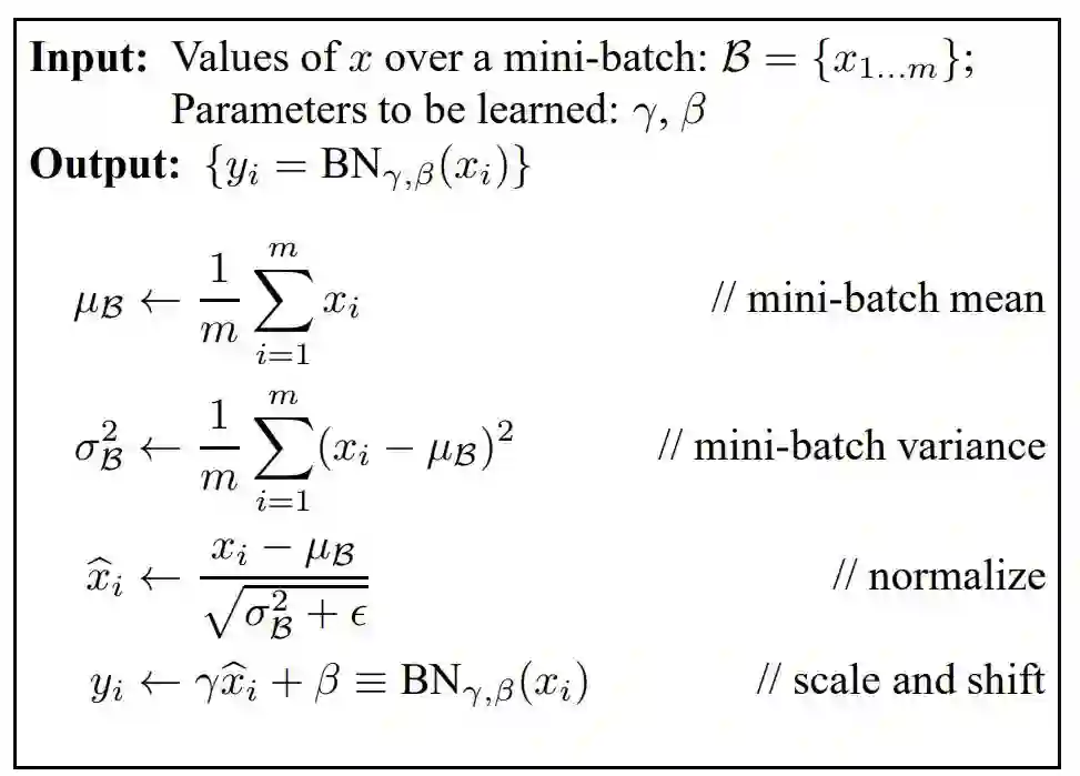 训练数据进行归一化处理有助于模型的优化,对于深度模型来说,归一化中间特征同样有助于训练,BN层就是最常用的归一化方法。BN层通过计算batch中所有样本的每个channel上的均值和方差来进行归一化,其计算方式如下所示: