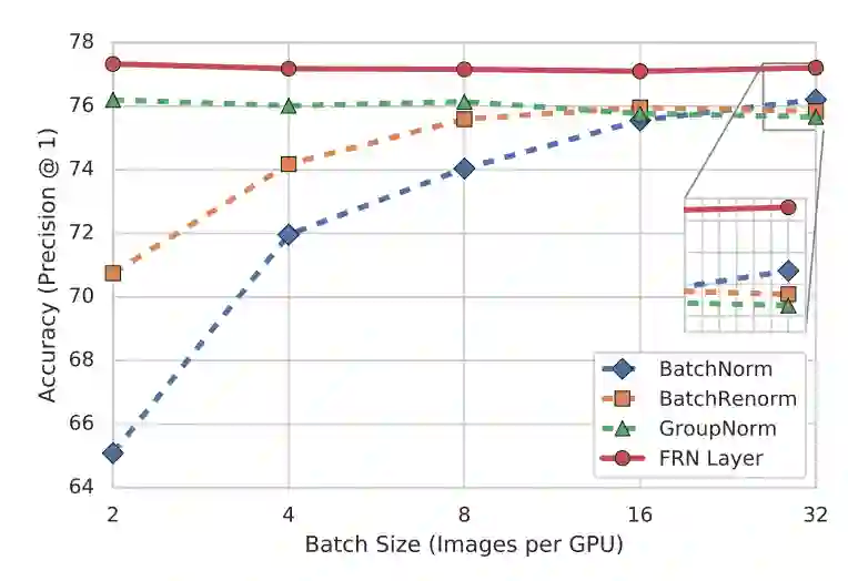 可以看到FRN是不受batch size的影响,而且效果是超越BN的。论文中还有更多的对比试验证明FRN的优越性。
