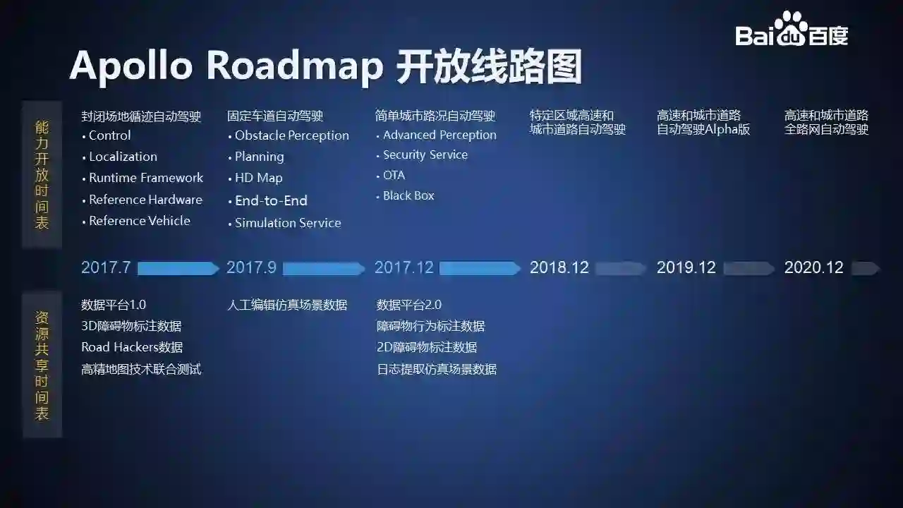 在 2017 年 7 月 1.0 中开放封闭场地循迹自动驾驶能力和资源,在 9 月 1.5 中开放固定车道自动驾驶能力和资源,在 2018 年 1 月 2.0 中开放简单城市路况自动驾驶能力和资源,之后会在 2018、2019、2020 年逐步开放特定区域高速和城市道路自动驾驶能力和资源,高速和城市道路和自动驾驶 Alpha 版,并最终到达高速和城市道路与全路网自动驾驶能力和资源。