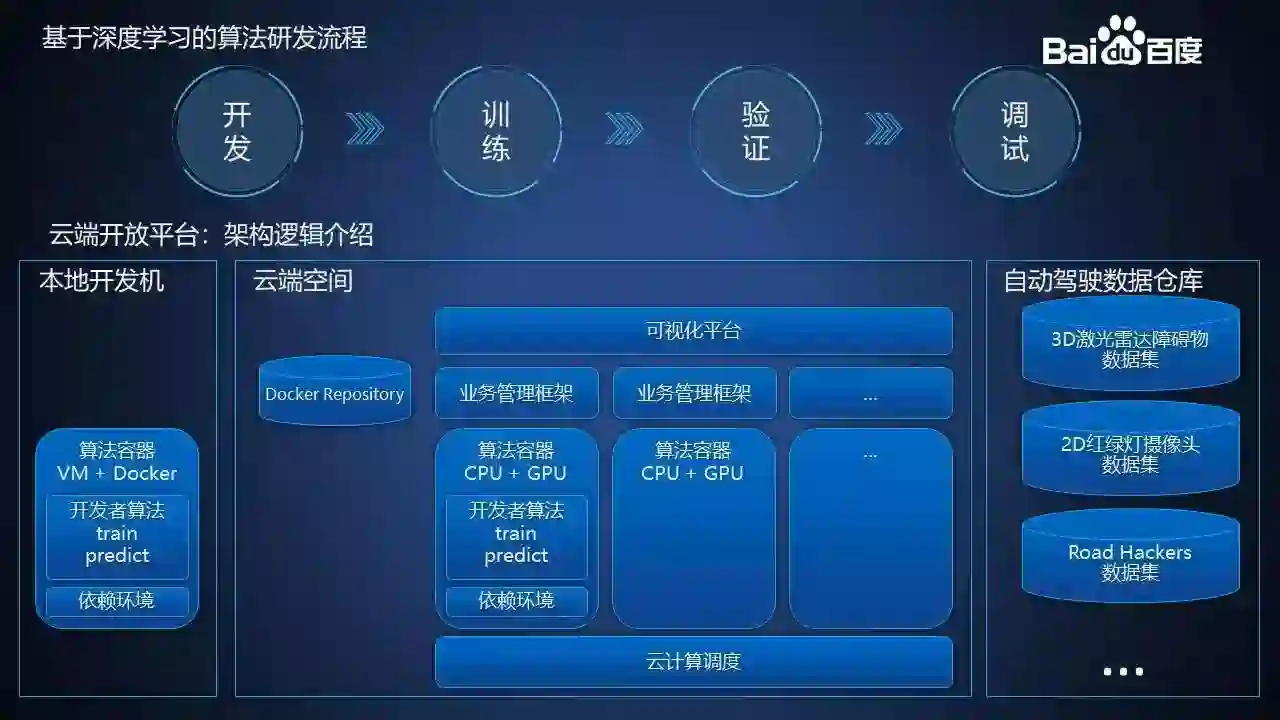 我们在自动驾驶的算法开发中,最大的痛点之一就是需要对海量数据集,反复尝试。我们通过将深度学习算法的研发流程 (开发、训练、验证、调试) 在云端实现,可以在充分利用云端大量计算资源的同时,将数据的流动仅在云端的服务器内完成,从而大幅提高算法研发效率。