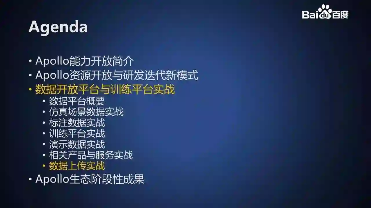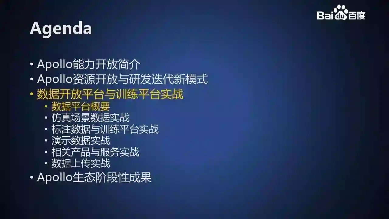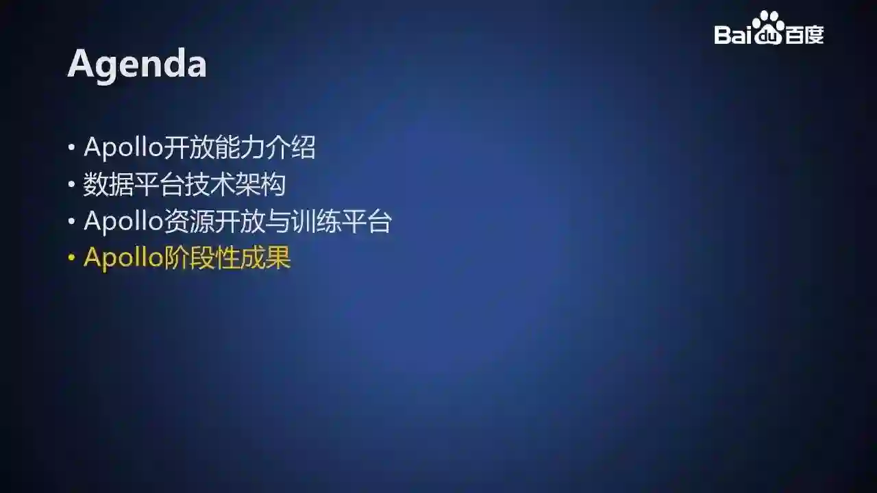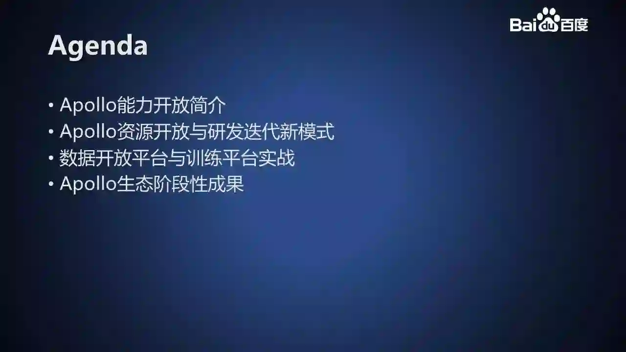 自 4 月 19 号宣布开放后,收到很多伙伴的反馈,其核心总结为 Apollo 宣言。自动驾驶行业正在快速走向未来,而最大的痛点在于技术壁垒太高,每个企业需要技术与人力的多年积累,才可以进入实质的研发。百度起步较早,有将近 4 年的技术积累,投入较早,将把能力开放给每一个合作伙伴,从 0 到 1,很快进入到无人驾驶的研发,从而提高无人驾驶行业的创新速度,避免重复造轮子。大家都把精力放在更有效的创新上。共享资源,合作伙伴使用 Apollo 技术资源,拿来即用;同时,每个合作伙伴,都可以贡献资源,贡献得越多,得到的越多。Apollo 受益,合作伙伴更受益。加速创新:数据加创新,汇集数据资源,公里数,覆盖的场景数,以后将远远大于任何一个封闭的体系持续共赢:百度的商业模式,基于百度的核心能力。能力与合作伙伴互补,Apollo 将是汽车工业的里程碑,Apollo 将产生核心的影响力。