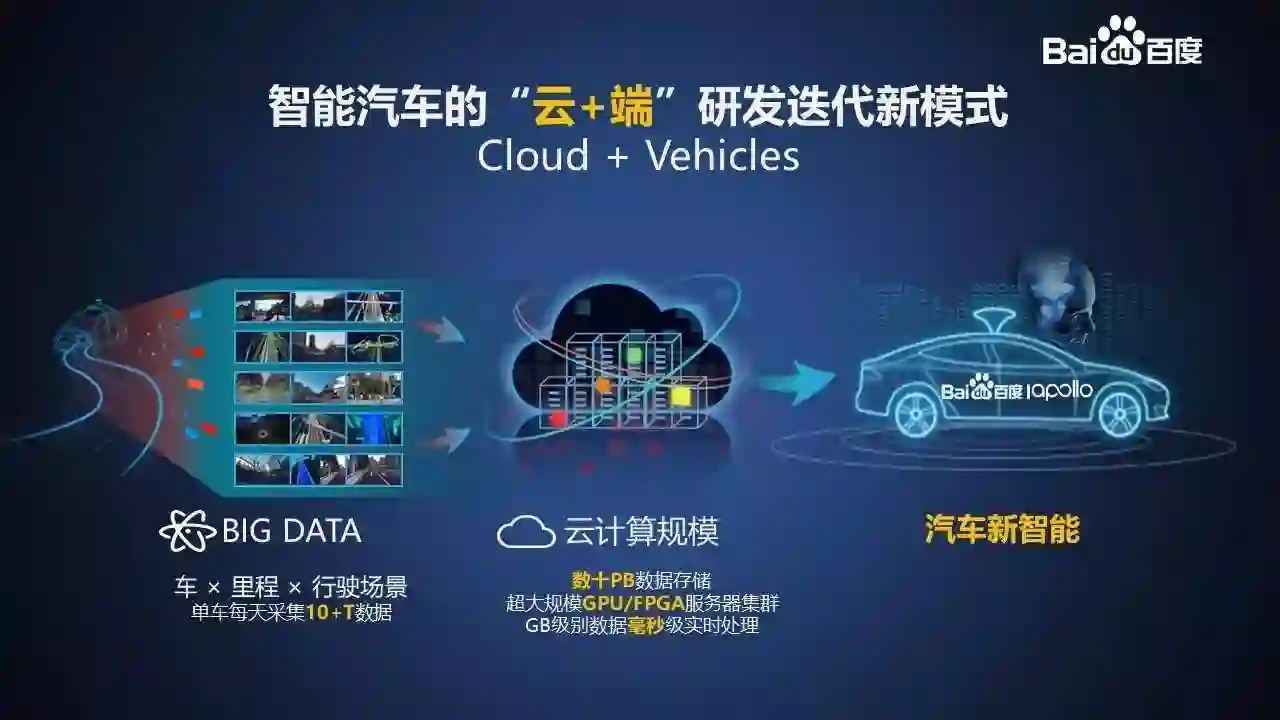 智能自动驾驶汽车需要一颗聪明的车载大脑。我们在自己的研发中一路探索过来,智能汽车的“云 + 端”研发迭代新模式是我们对于加速自动驾驶汽车研发效率提出的解决办法。我们在车辆上积累海量的数据。