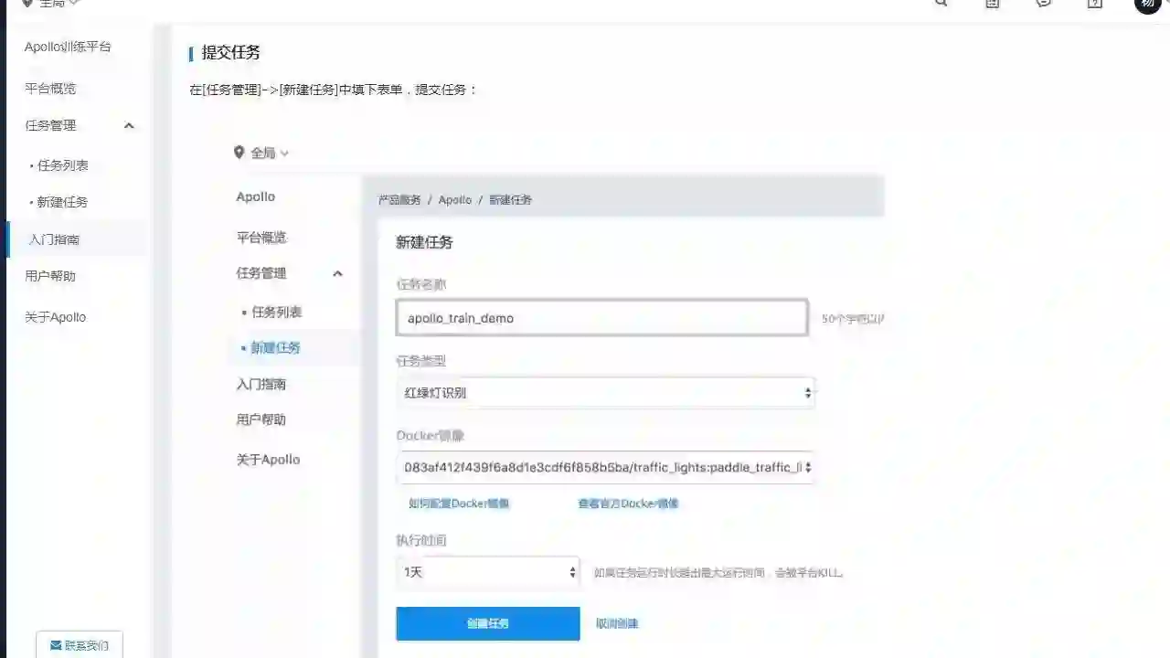 进入到训练平台的新建任务中,填写任务信息后提交任务。