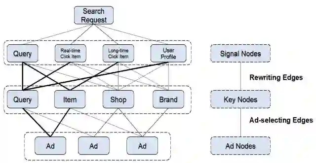 图3:用户行为异构图图示例。图中包含了三种节点:用户搜索信号、广告检索键和广告。用户搜索信号和广告检索键之间的边表示改写,广告检索键和广告之间的边表示广告海选。