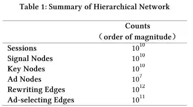 面对上述传统搜索广告检索系统中存在的各种难题和挑战,阿里妈妈搜索直通车算法团队的同学提出了一种创新的搜索广告智能检索系统。新的智能检索系统首先使用用户在平台上的历史行为构建出一张庞大复杂的用户行为异构图。异构图中节点分别表示“用户搜索信号”、“广告检索键”和“广告”,边分别表示“用户搜索意图信号改写”关系和“广告召回”关系。接着,检索系统面向平台RPM、CTR等指标,学习异构图中边的权重,挖掘出重要的改写关系和广告召回关系。