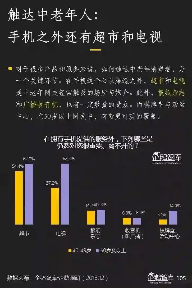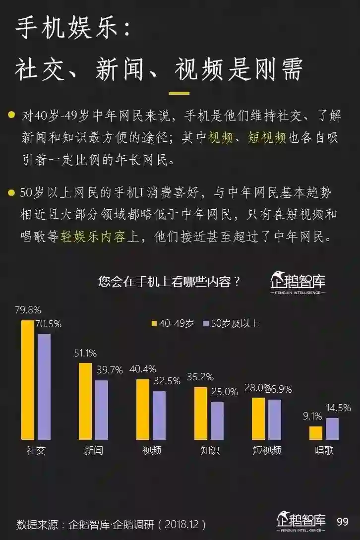 社交、新闻、视频是中老年网民在手机上消费的主要内容,其中老年网民对轻娱乐类内容需求不容忽略。