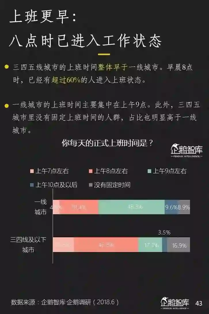 对三四五线城市的网民来说,他们平均上班时间,比一线城市要早一个小时。但他们实际上,在上班路上消耗的时间要比一线城市少很多。