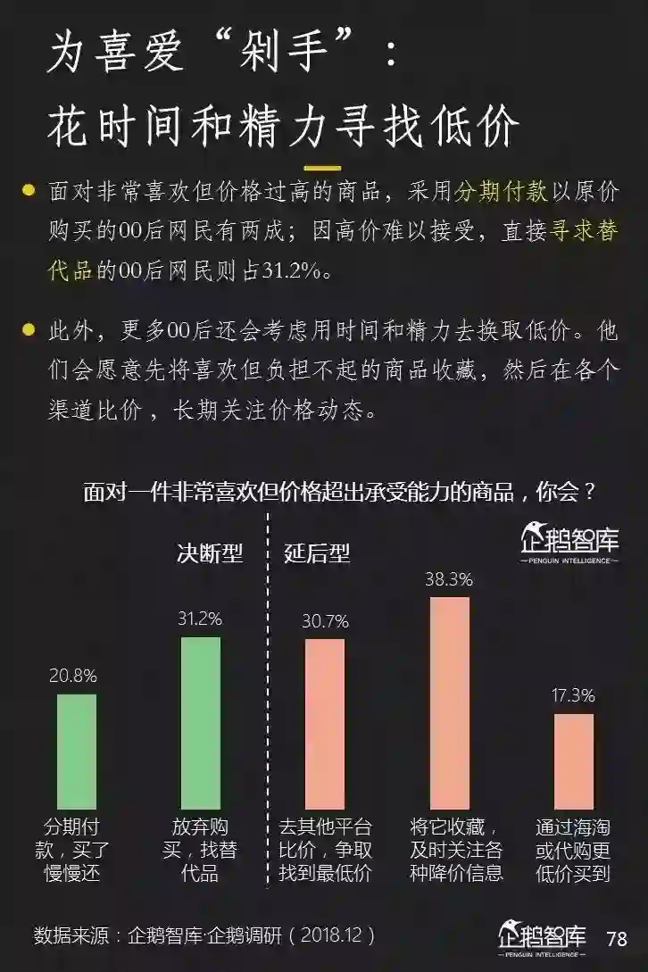 00后呈现出明显的提前消费意愿,同时,他们还更愿意花费很多时间,精力甚至等待,去寻找更低的价格来购买喜欢的商品。