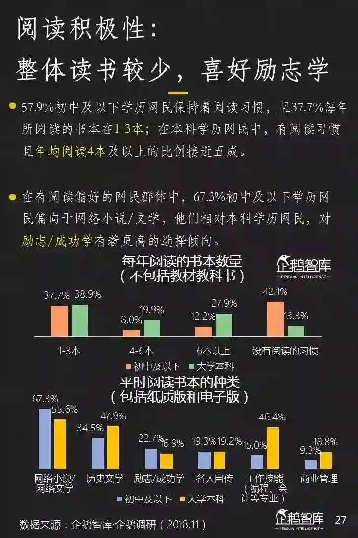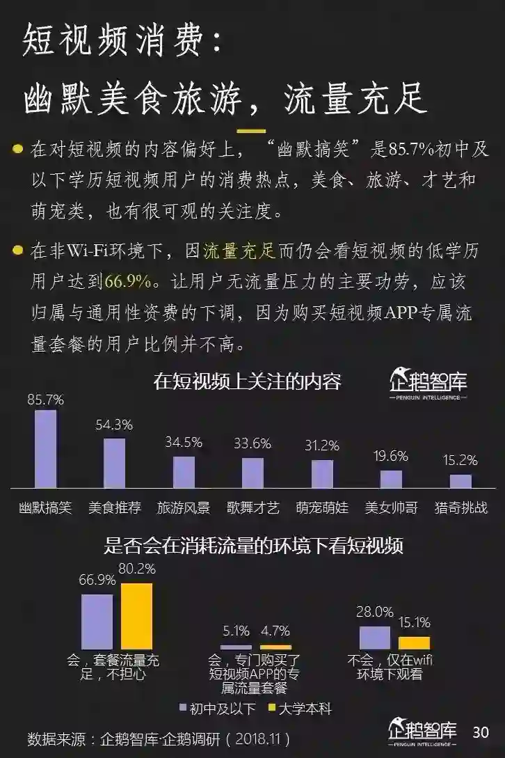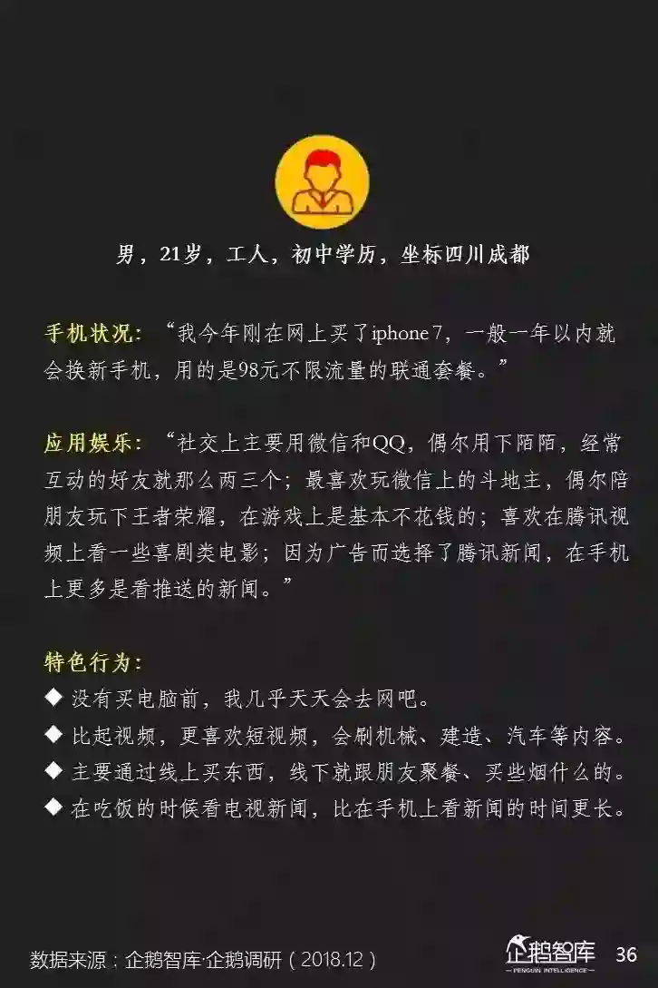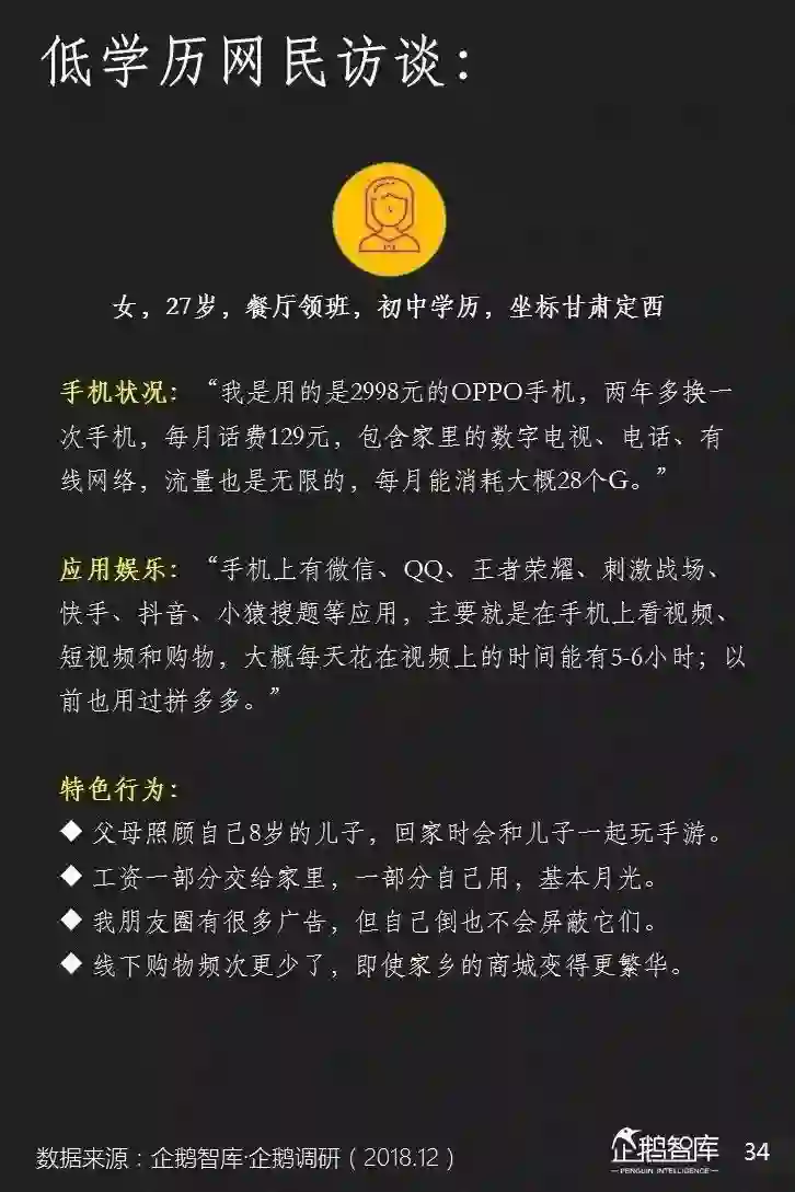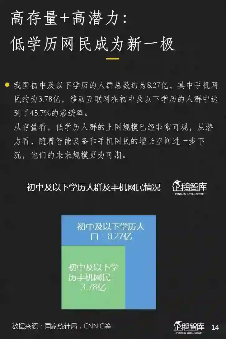 4、庞大的初中及以下学历网民,对手机很依赖。互联网不仅为他们提供娱乐,还影响着他们的消费和认知;