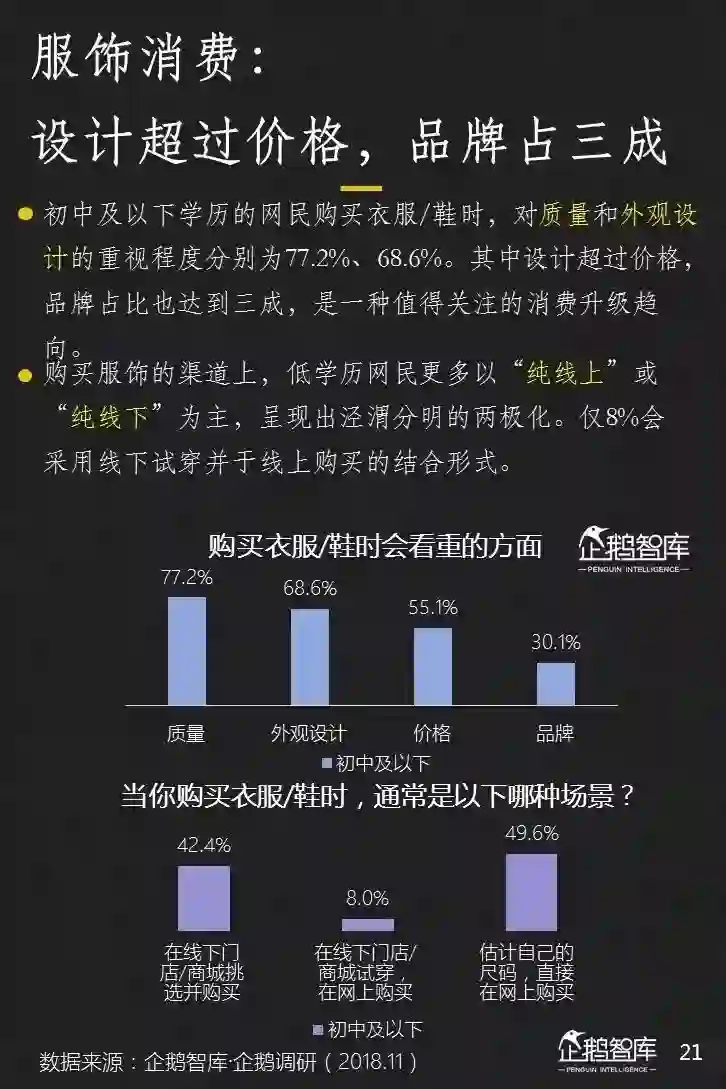 在消费升级这个热话题上,我们以服饰为切入点,看到了低学历人群在设计、品牌方面的消费倾向,以及背后所代表的一种更为多元化的消费诉求。