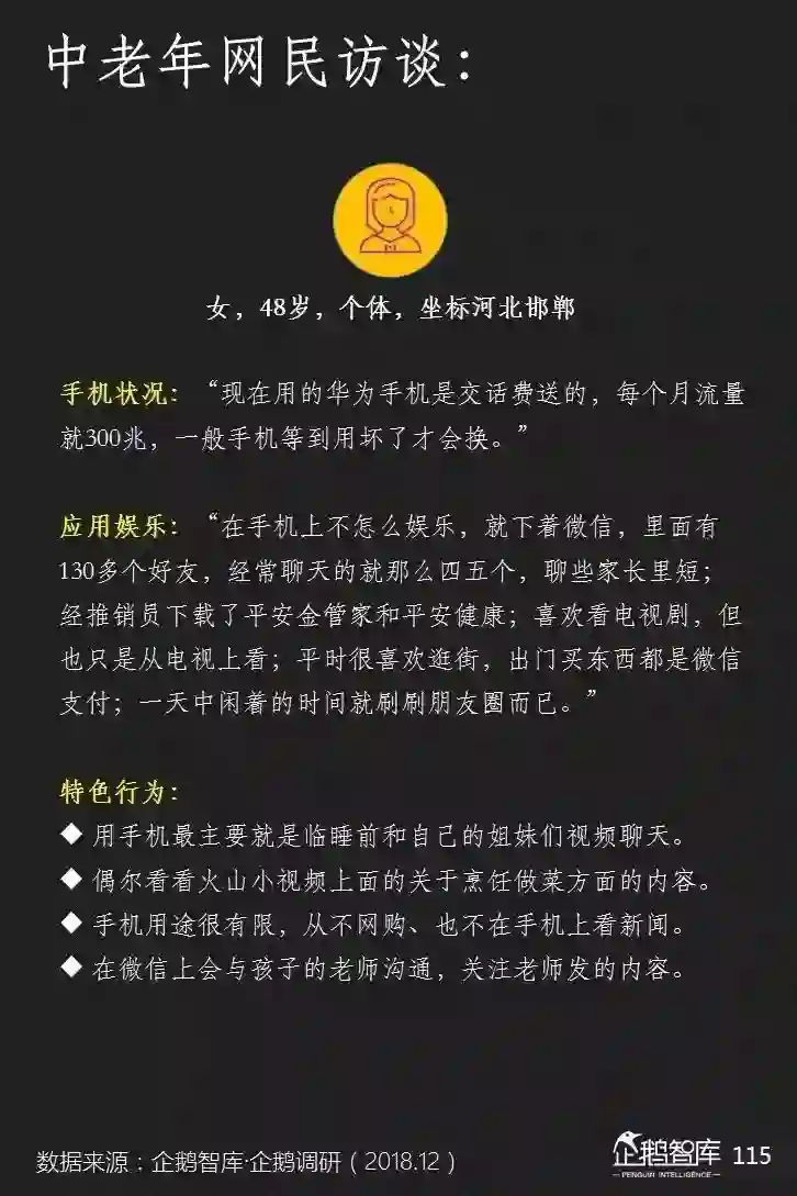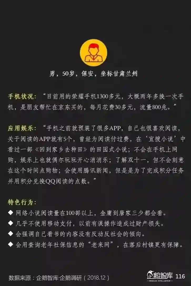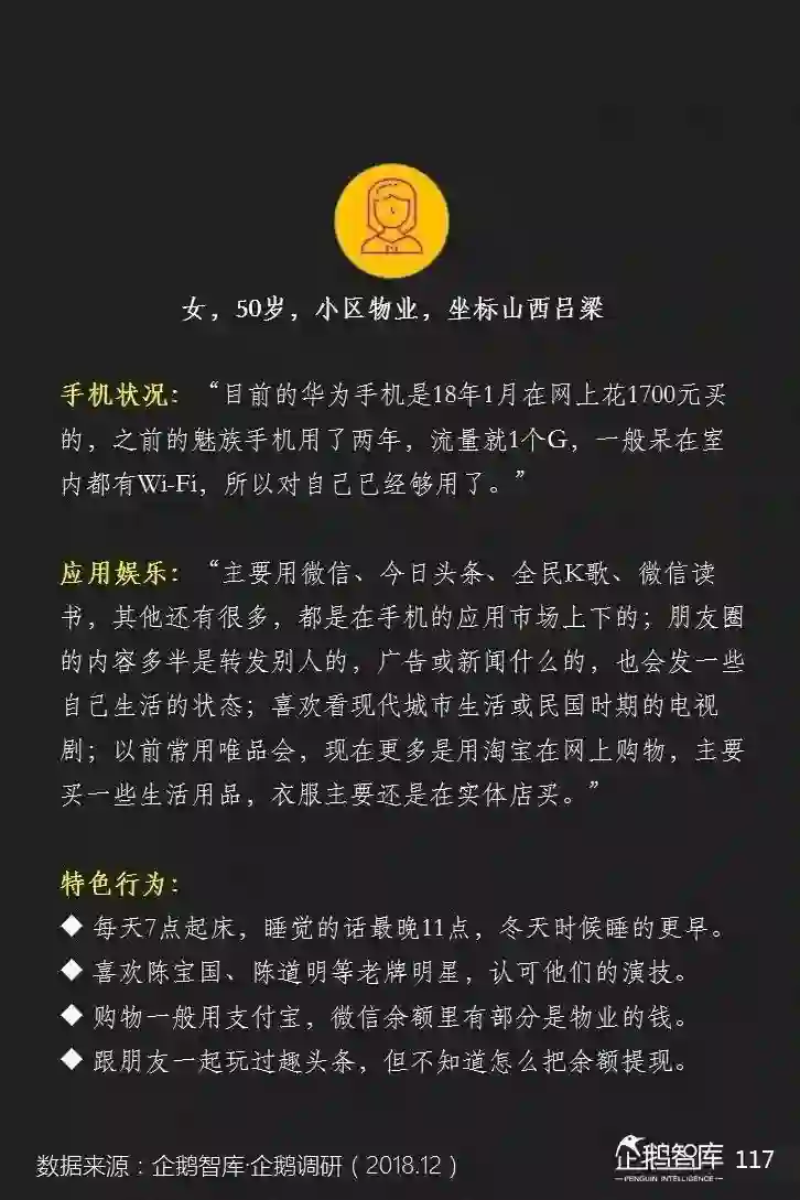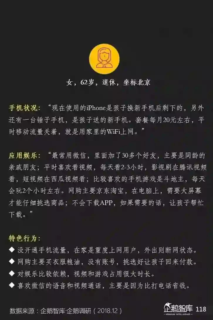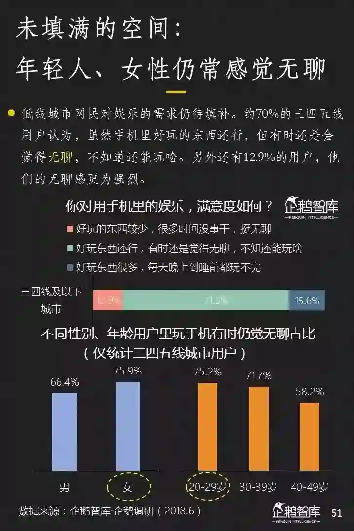 他们的智能手机上,平均安装的APP更少,可消费的碎片化和整段休闲时间更长,对单一产品的沉浸度相对也更高——这些是我们通过互联网的数据,可以感知到的一些特性。