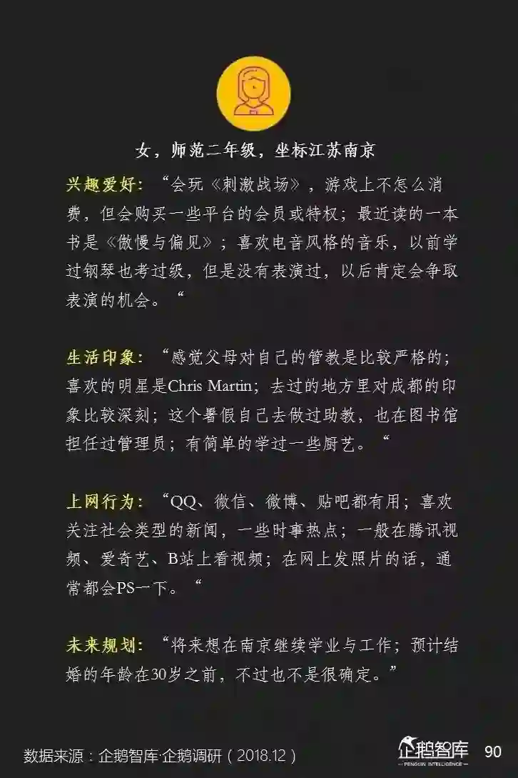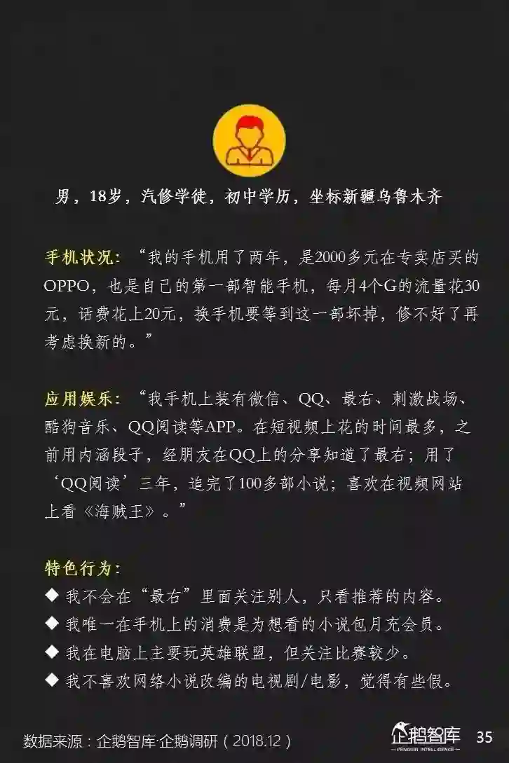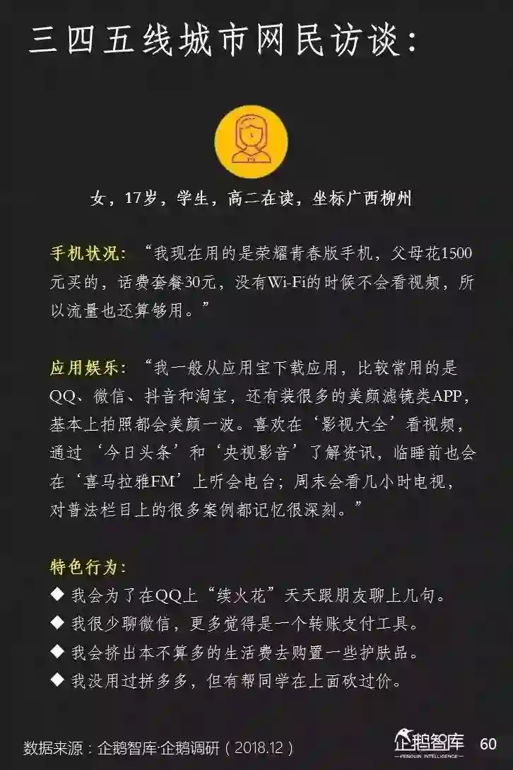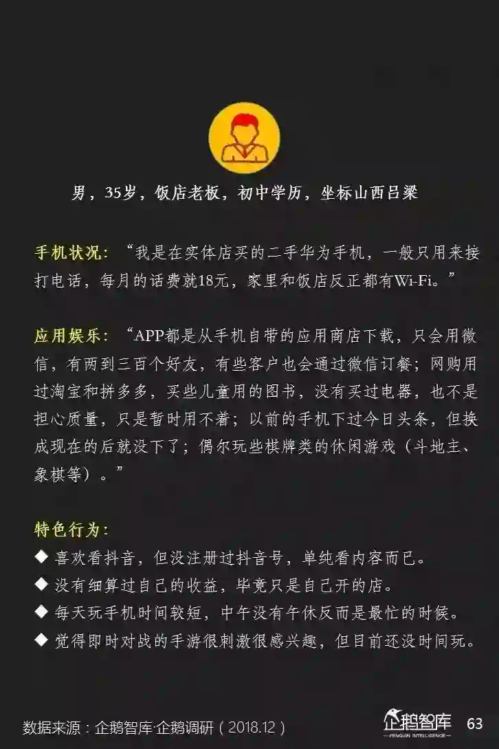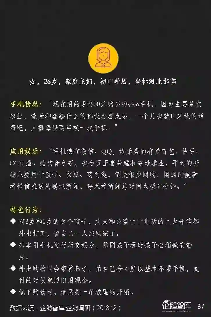 他们的智能手机上,平均安装的APP更少,可消费的碎片化和整段休闲时间更长,对单一产品的沉浸度相对也更高——这些是我们通过互联网的数据,可以感知到的一些特性。