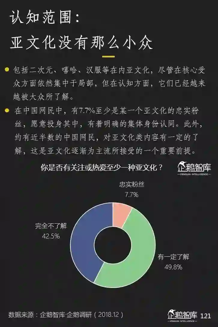 比起小众类文化,亚文化实际上已经越来越被主流人群所认知了了解,特别是在网民这个层面,超过半数的人是对至少一种亚文化有认知或者成为其拥足。
