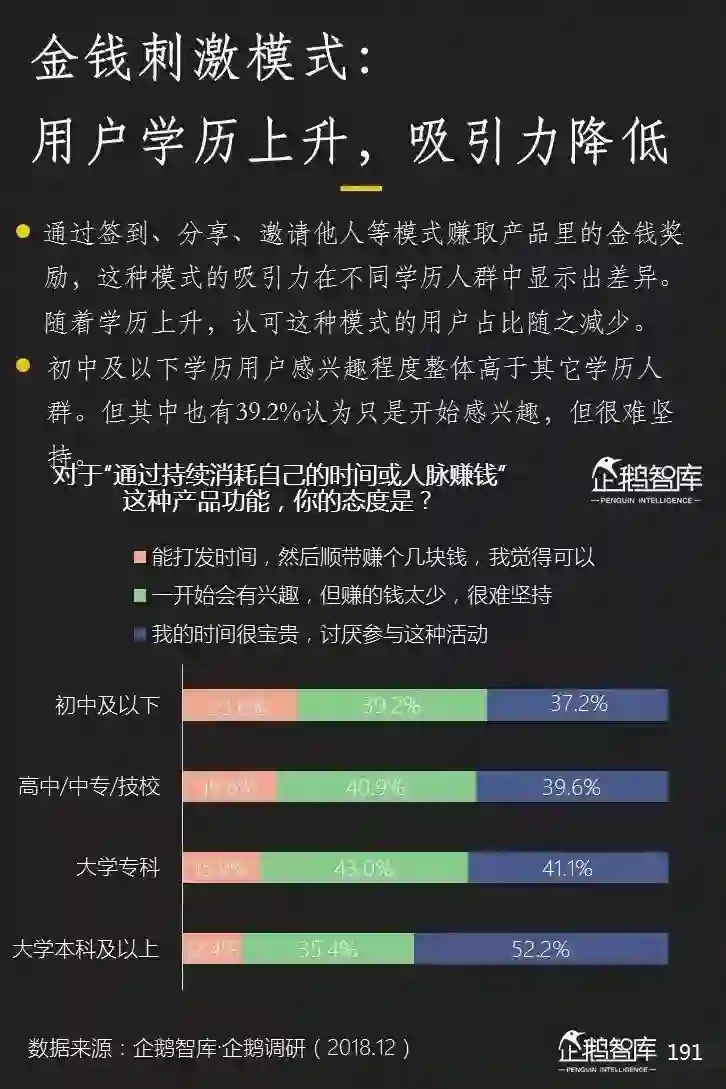这里面既有低学历用户自身的使用习惯问题,也和市场上社区类产 品的内容,氛围和运营机制,对低学历人群存在更高接受门槛有相关。