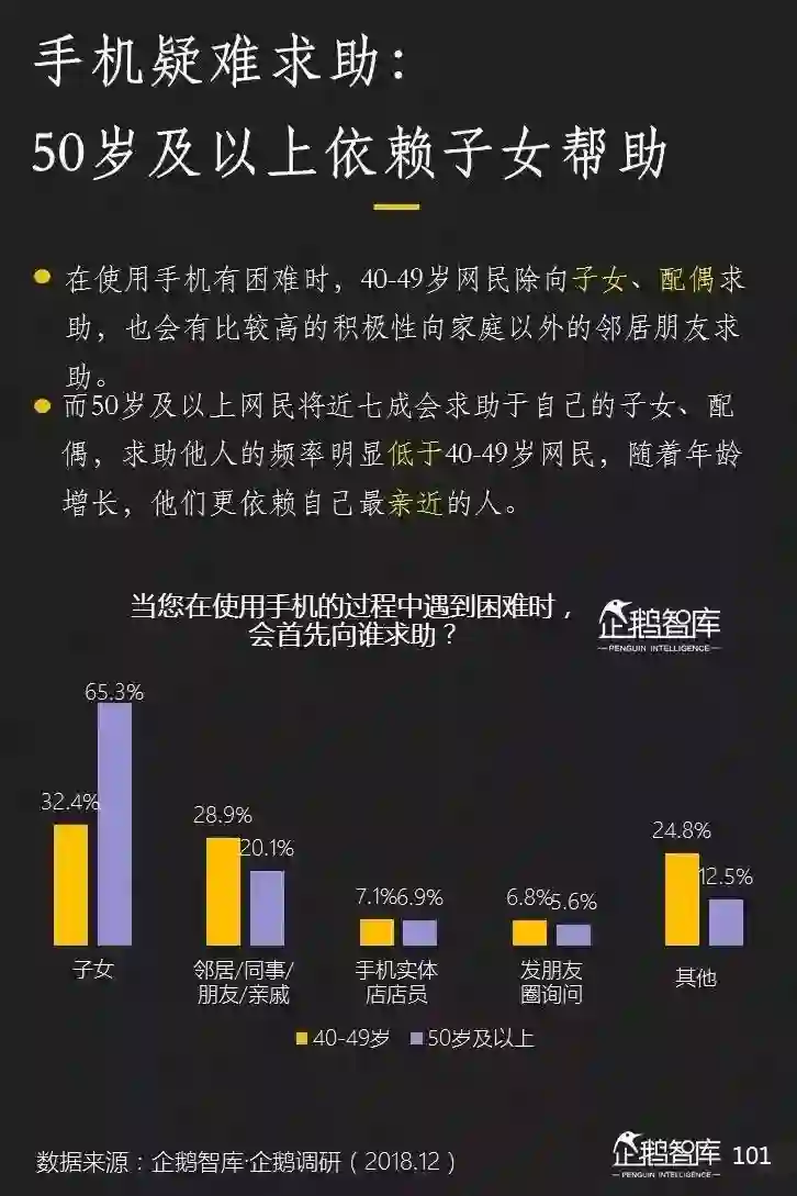 50岁以上网民对手写输入法依赖度很高,当使用手机遇到困难时,子女是他们最主要的求助对象。
