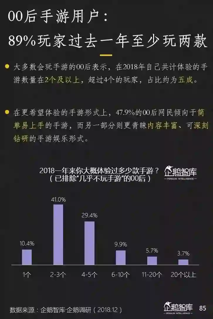 还有游戏。00后 的游戏玩家中,90%过去一年至少体验过两款手游。体验过四款及更多的玩家,占比接近50%。