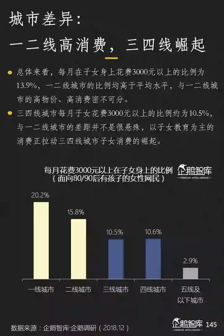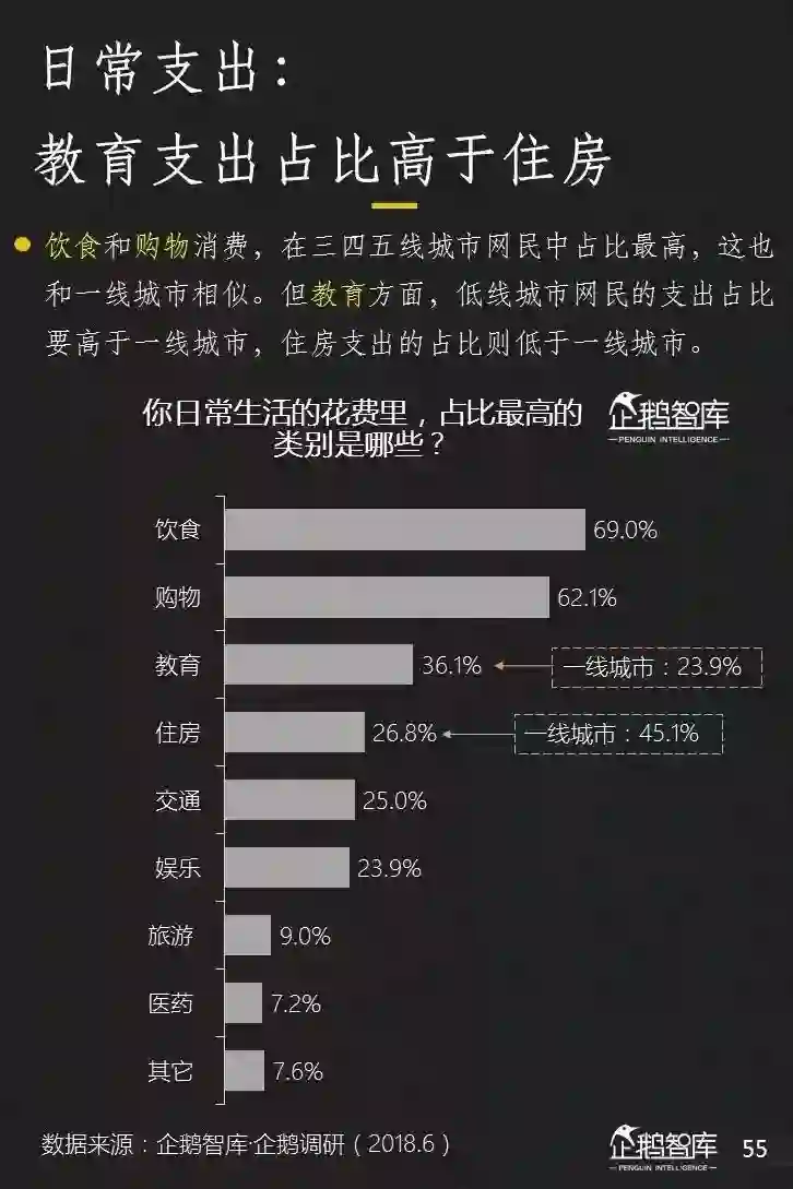 饮食和购物成为低线城市网民日常消费的主要领域,此外,他们在教育上的投入占比,明显高于大城市。