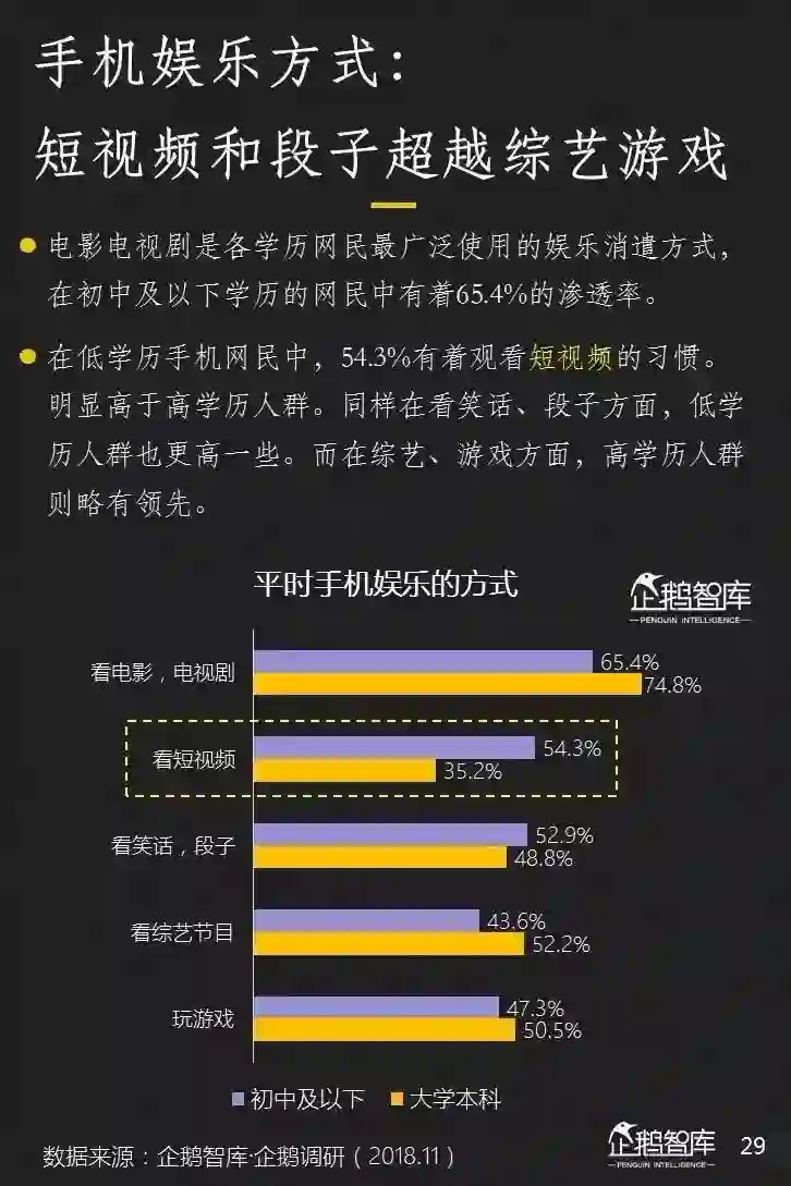 高学历用户更喜欢的是综艺和游戏类手机娱乐,而低学历人群中,对短视频和幽默段子的喜好度更高。