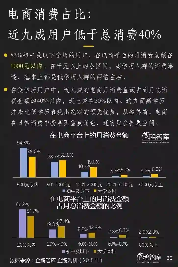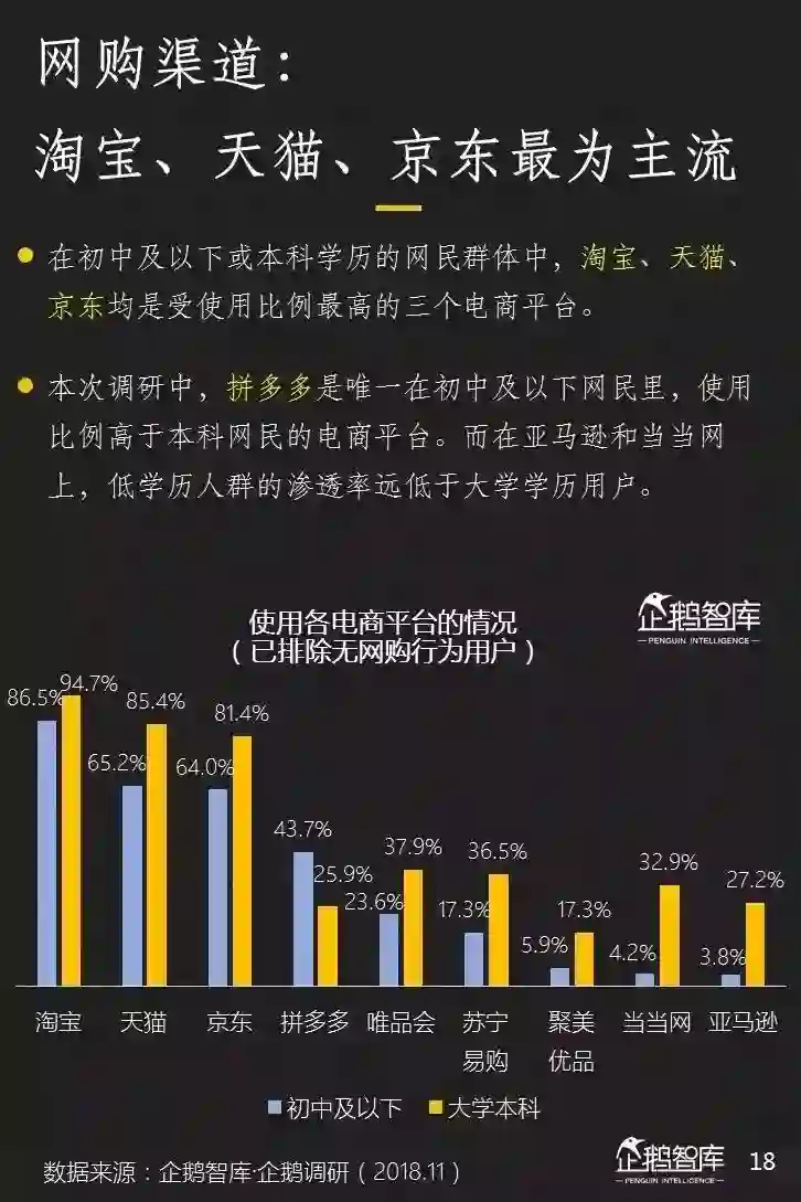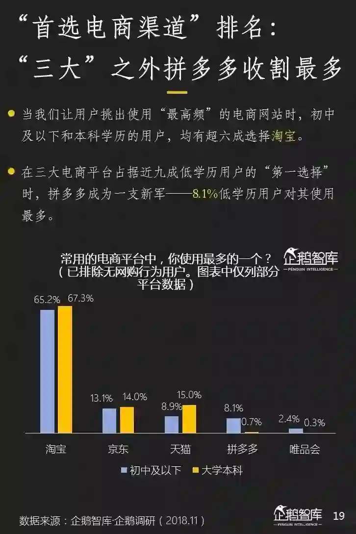 淘宝、京东、天猫仍然占据了最重要的市场份额,拼多多成为新崛起者。在消费额度,占比等方面,低学历人群均呈现出值得期待的潜力。