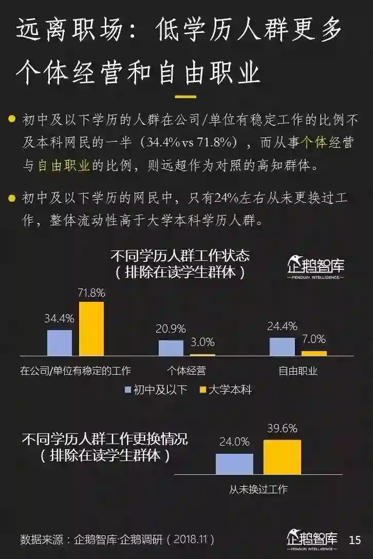 在互联网之外,我们同样关切他们的基础属性。相对比高学历人群,初中以下学历网民,从事个体经营和自由职业的比例非常高,这意味更大的时间自主性,和更高的非职场社交和信息需求。