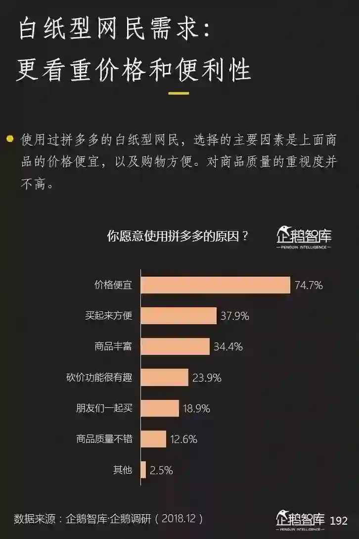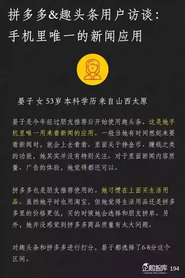 对互联网产品尚未形成使用习惯和偏好;过去更多在线下进行消费,使用智能手机和互联网时间并不长;对价格敏感,对质量,品牌和设计重视度相对较低;有更充足的时间,并愿意消耗它们来换取微小的报酬;有压力更低的社交圈层,以亲属邻居为主,可以接受“打扰式”的传播分发。