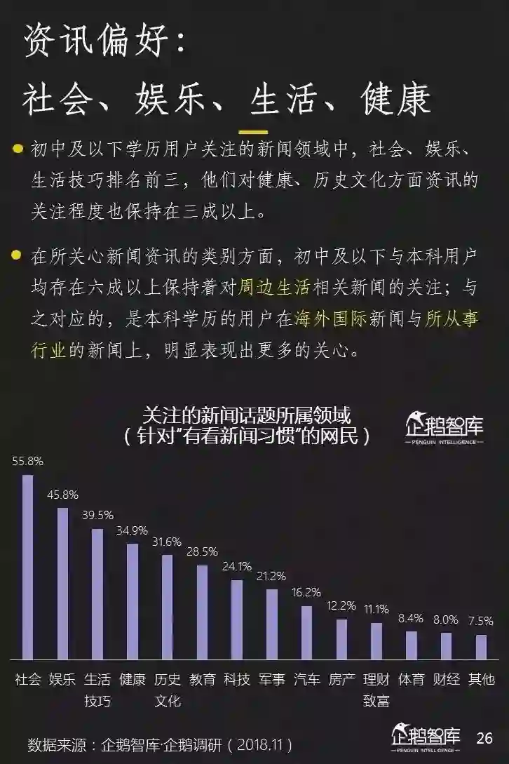低学历网民在对社会和娱乐新闻保持着非常高的关注度,同时,他们也对生活技巧和健康类内容,有着明显的偏好。相比于关注世界大事,他们更关心身边发生了什么。