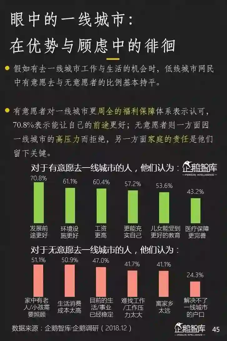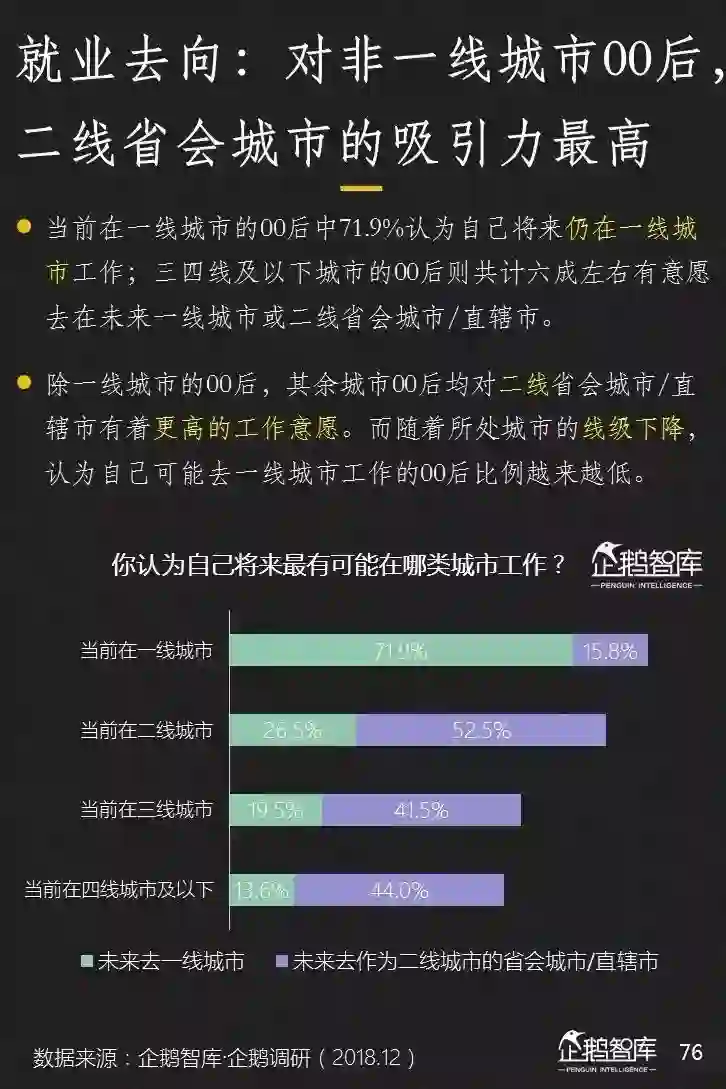 在对未来工作和生活城市的选择上,年轻人开始分化了。一线城市的00后更多愿意留在大城市;而二三四线城市的年轻人们,他们愿意前往线城市的意愿很低。