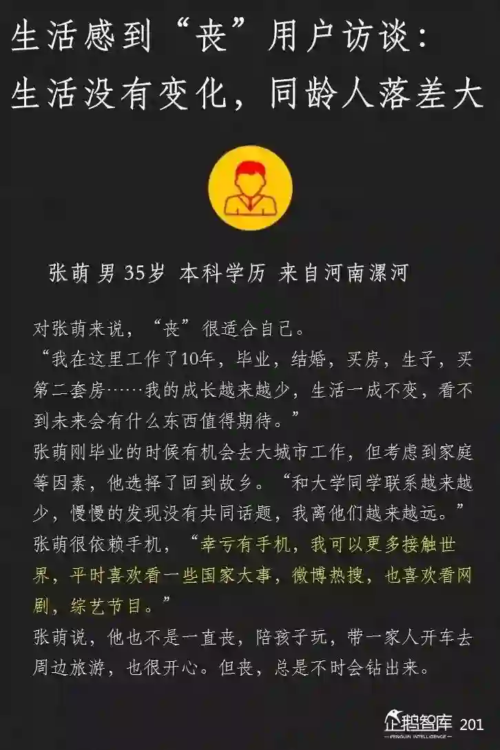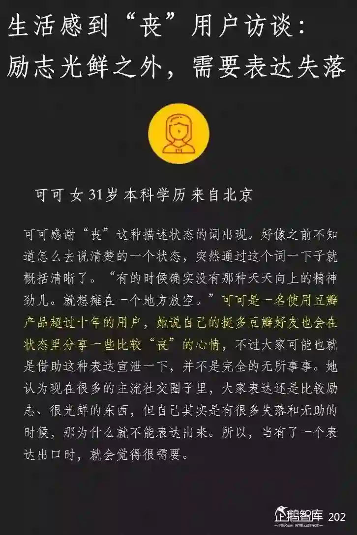我们讨论丧,更期待是有更多的产品和服务,可以给小确丧”的网民,特别是年轻网民,一些缓解和治愈。无论是社交类产品,娱乐类产品,还是学习类产品。