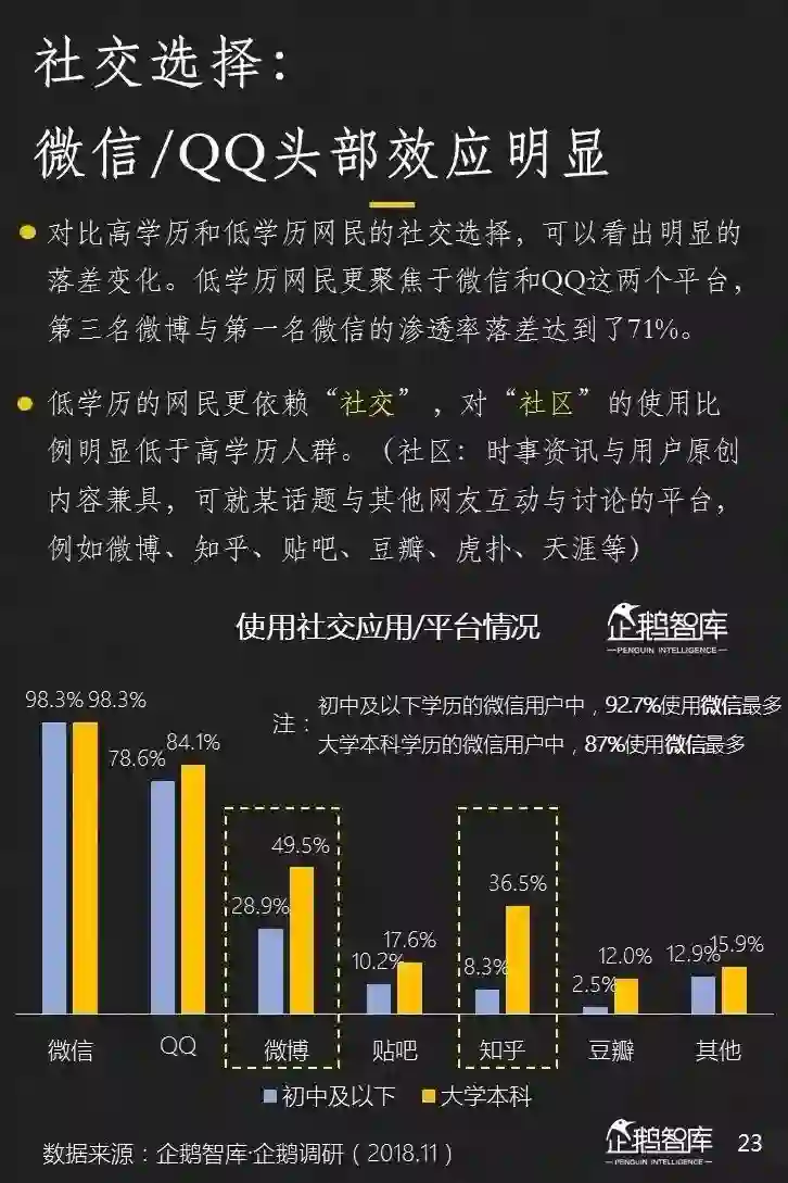 社交是今天移动互联网的核心场景,在对比低学历和高学历网民时,我们发现了一个明显特征。
