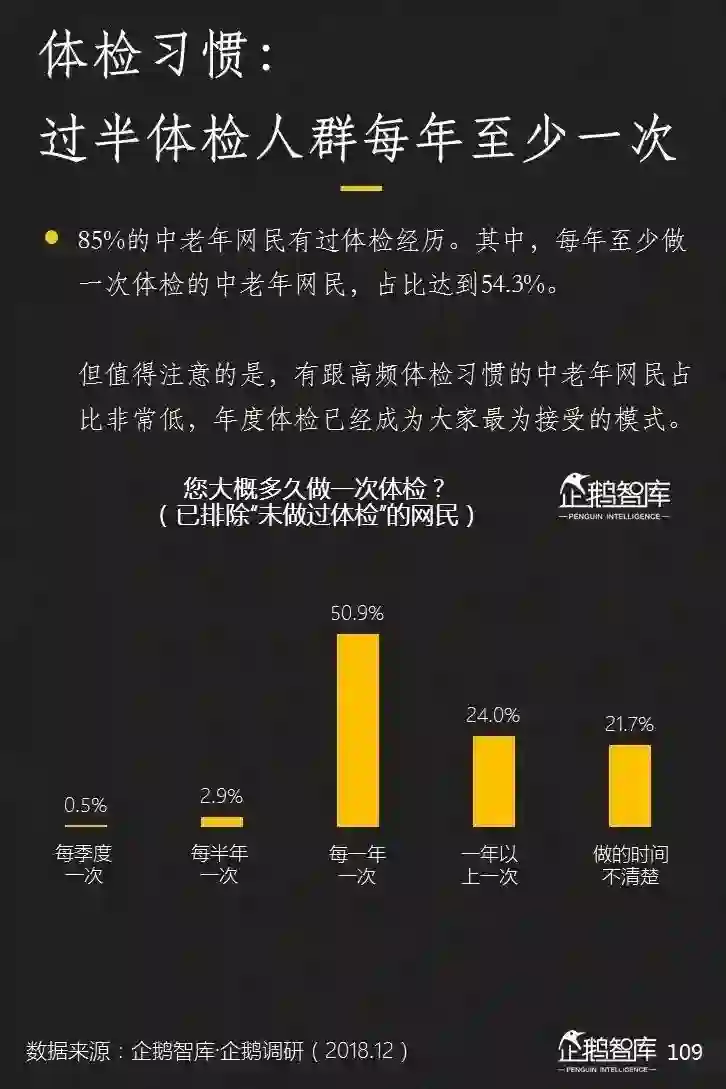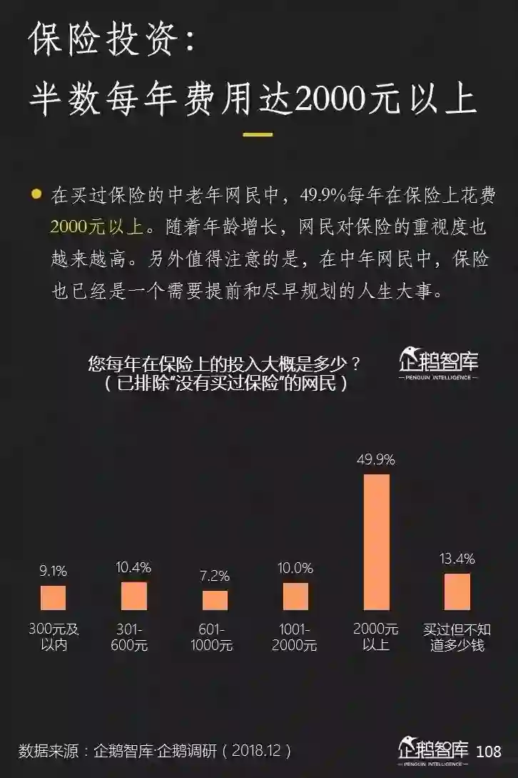 在购买保险方面,有过购买经历的中老年网民,每年金额集中在2000元以上区间,甚至更高;在体检方面,有过体检经历的中老年网民,超过半数的体检频率可以保持每年至少一次。