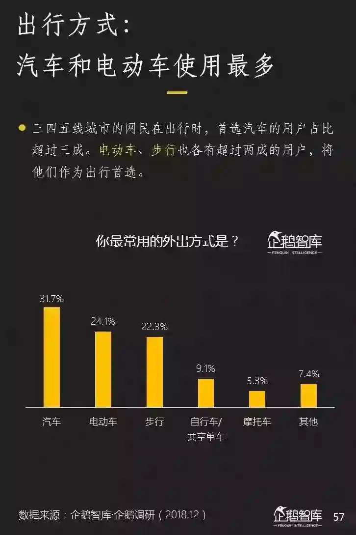 尽管汽车(包括 私家车和公共交通)仍是排名第一位的出行工具,但电动车在三四五线的交通中同样占据了非常重要的位置。